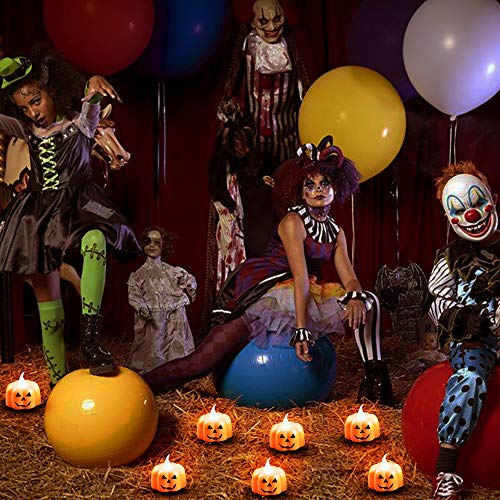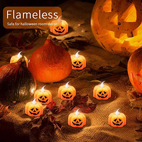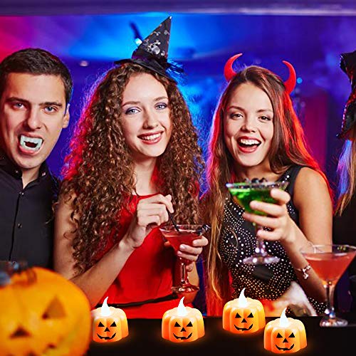 • 🎃12PCS Pumpkin LED Tealights: A set of 12 tealight candles with pumpkin shape, orange color and evil face, packaged nicely, perfect for Halloween party decoration or Halloween house/family decor.