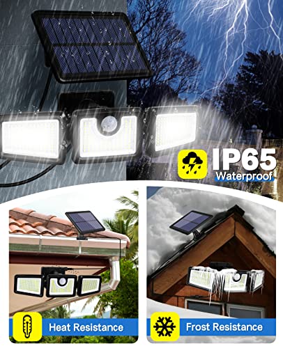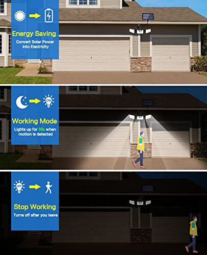 - 【IP65 Waterproof & Heat Resistant】IP65 waterproof enables the solar floodlight work properly and durably in extreme weather (Rain, Snow, Freeze, etc). Great heat dissipation helps the solar panel to have a longer lifespan. Easy installation make it fits for your backyard, garage, patio, front door and garden.