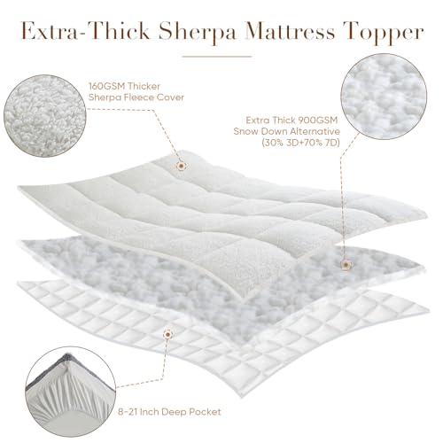 King Mattress Topper, Cymula Extra Thick Sherpa Mattress Pad with 900GSM Down for Back Pain Bed, Soft Plush Mattress Cover Fluffy Pillow Top with