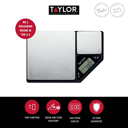 - Precision Accuracy - Dual brushed stainless steel food-safe platforms for weighing multiple items and larger quantities, accurate down to the last gram or ml