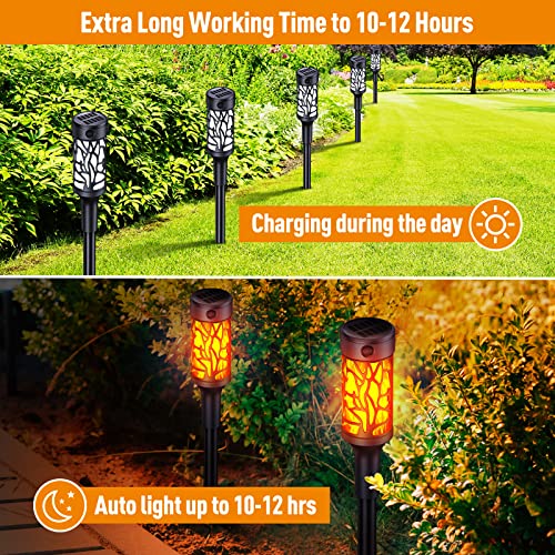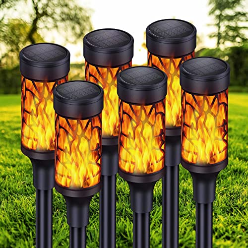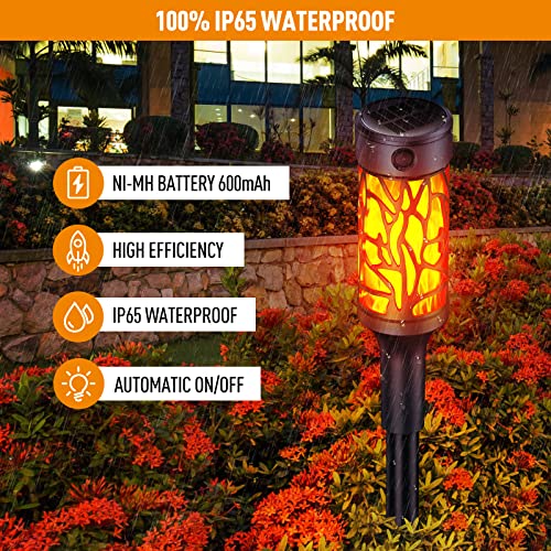 - 【Withstand All Kinds Of Weather】Corrosion resistant ABS plastic ensure the durability and long service life of outdoor use. IP65 waterproof design allows you to use these solar flickering dancing flame lights confidently even in bad weather, no need to worry about strong wind, heavy rain, snow, frost or sleet. You can enjoy the fantastic ambience these solar flame lights bring to your garden.