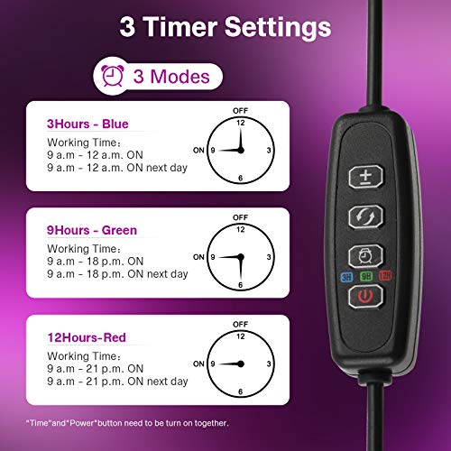- 【Auto Turn On/off Function】The plant grow light with 3 timing modes (3/9/12 hours) has a memory function. If the status indicator remains connected, the grow lamp will automatically turn on and off at the same time each day (according to the time set before), which will take good care of your plants when you are not at home.