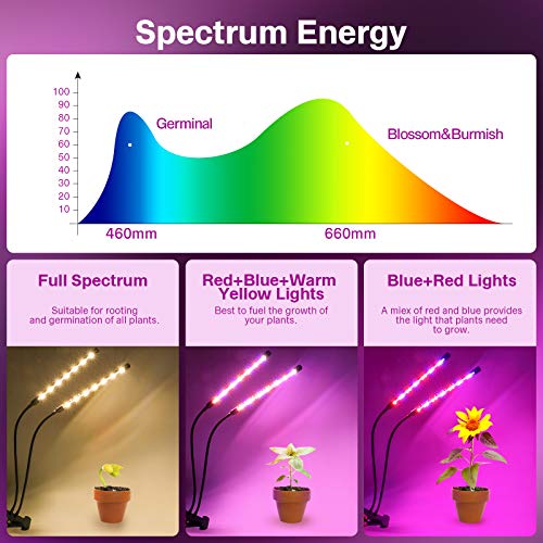 - 【3 Light Modes & 10 Brightness Levels】The grow lights for indoor plants has 3 lighting modes: red + blue, red + blue + warm light, warm white light. Red light promotes the photosynthesis of plants, and blue light activates chloroplast activity. Yellow light helps plants grow and germinate. And 10 brightness settings ranging from 10% to 100%.