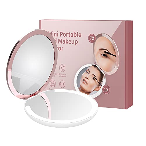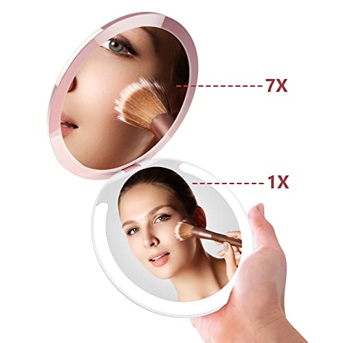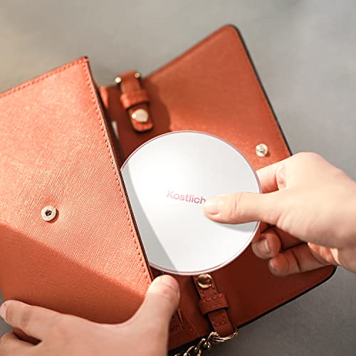 Kostlich LED Lighted Compact Makeup Mirror for Travel, Rechargeable, 1X/7X Magnifying - Large 127mm Wide Portable Mirror for Handbag