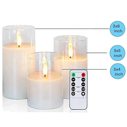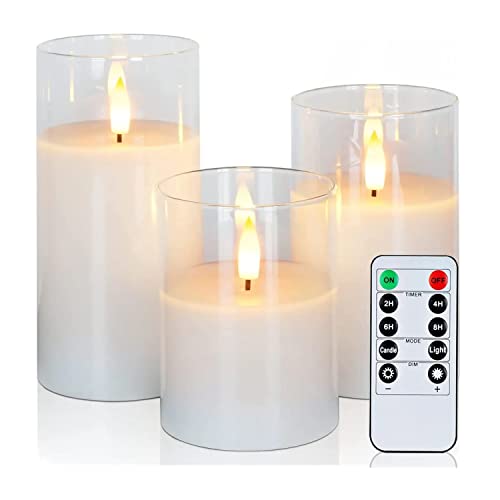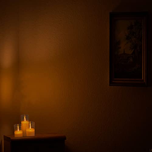 - Realistic Flameless Candles: These realistic glass candles add a warm and cozy glow to your home. The set includes 3 cream waxed candles which are housed in clear glass casings for a stylish, modern look. The set also includes a remote control with a timer and dimmer to set a perfect ambience.