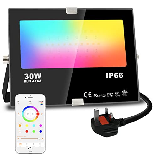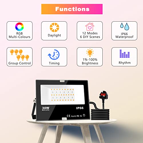 - LED floodlight with APP control: 30W, Warm White (2700K), CRI>85, 3000LM; Colourful RGB static colors and 12 dynamic mode. Suitable for daily lighting and decoration lighting. NO REGISTRATION, NO NETWORK.