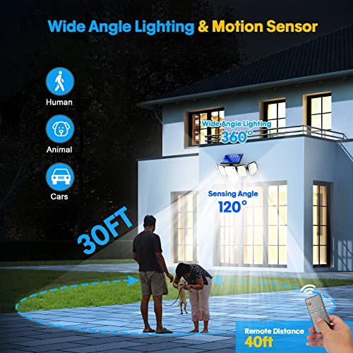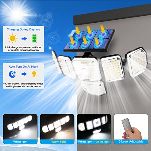 - 🏃【Two Colors Light & 3 Lighting Modes】The solar security lights outdoor motion sensor has white color light and warm color light with 3 smart modes: ① Constant light mode: automatically turns on at night and stays medium bright all night. ② Shimmer sensing mode: provides dim light in the dark and changes to maximum brightness when motion is detected. ③ Strong light sensing mode: turns on maximum brightness when motion is detected and turns off after 15s when no motion is detected.