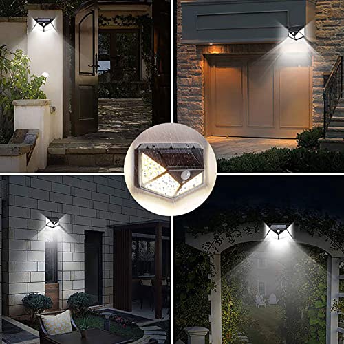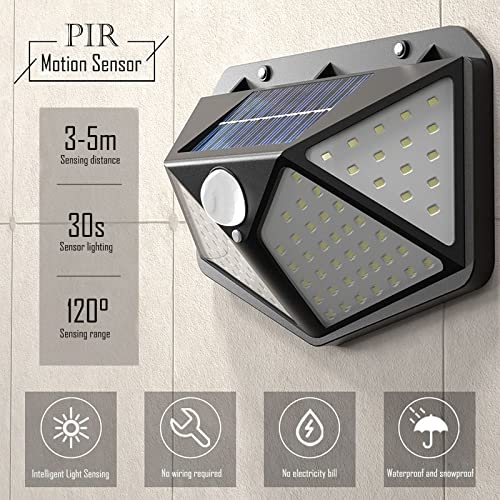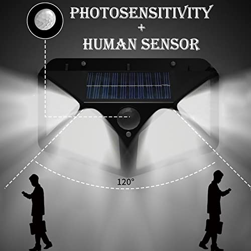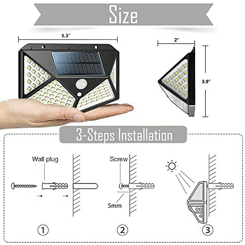 - 【IP65 Waterproof & Easy to Install】 The garden lights solar powered waterproof are made of IP65 waterproof ABS material. Even if the outdoor weather is bad (Frost Resistant / Heat Resistant / Water Resistant), it still works great. No annoying wires or adapters needed when using them. You can find a place that can absorb solar energy, such as gardens, fences, terraces, driveways, gates, etc and then fix outside lights with sensor with the attached screw. The ideal installation height is about 2-3 meters.