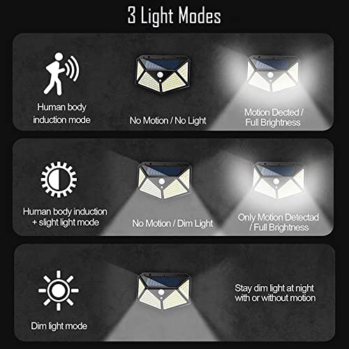 - 【3 Intelligent Lighting Modes】1) High lighting mode - When people pass by, the motion sensor solar lights outdoor will light up with strong brightness, and turn off automatically when no one is nearby. 2) High lighting + slight lighting mode - When people pass by, the garden lights will light up with strong brightness. When no one passes by, garden solar lights always light in dim mode. 3) Slight lighting mode - the motion sensor light is always in slight light state no matter whether anyone passes by.