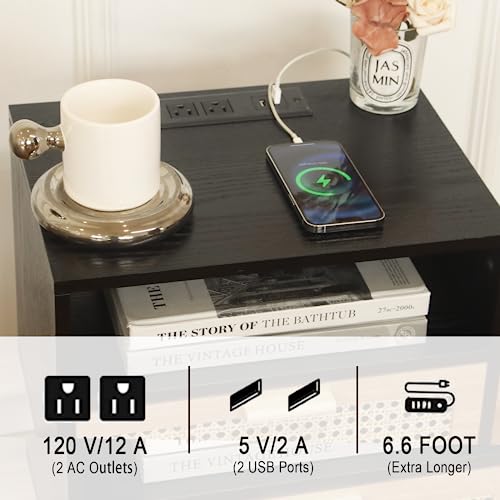- Bedside Tables with Charging Station: The plug contains 2 3-Prong Power outlets and 2 USB ports. It's easy to charge your phone, computer, any electric device etc. The power cod is 6.6 ft long, everything is within your arm's reach.