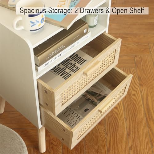 MaxSmeo White Nightstand with Rattan Drawers, Mid Century Modern Bedside Table, Boho Wood Nightstand for Living Room and Bedroom, White