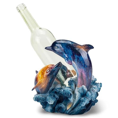 - This wine bottle holder showcases two dolphins leaping joyfully, creating a mesmerizing display that will elevate your wine collection with elegance and charm