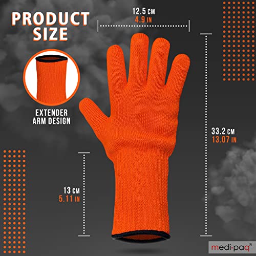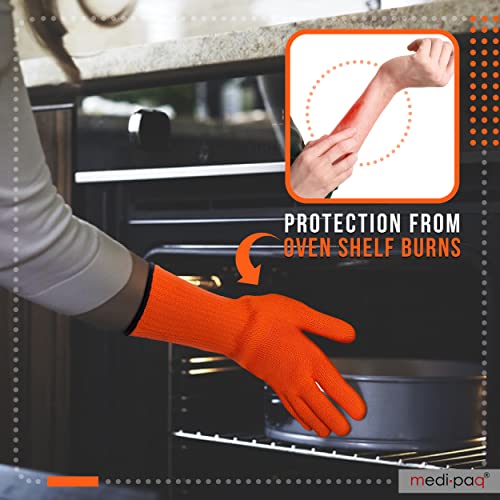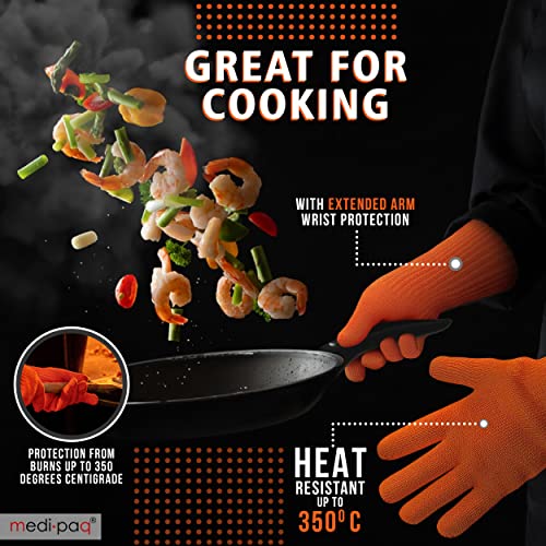 - EXTRA LONG ARMS: This unique feature on each glove stops you from burning your wrists on oven doors and sides, cooking trays and hot utensils.