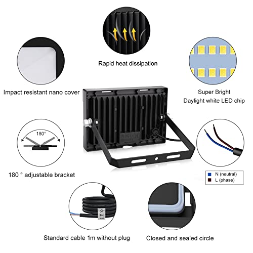 - [Safe and Durable] The unique housing on the back of MEIKEE Led floodlight outside provides ideal conditions for heat dissipation, it also provents the inside of spotlight from overheating and prolongs the life of outdoor floodlight. Approximately 1m cable, the wire gauge reaches high standard of 1mm², which greatly improves the safety of using LED floodlights