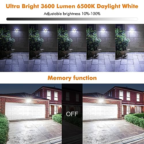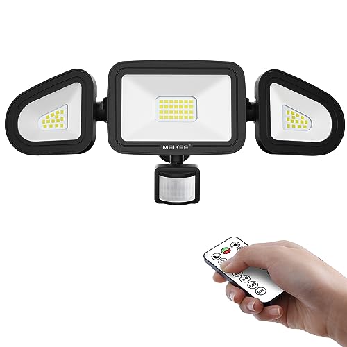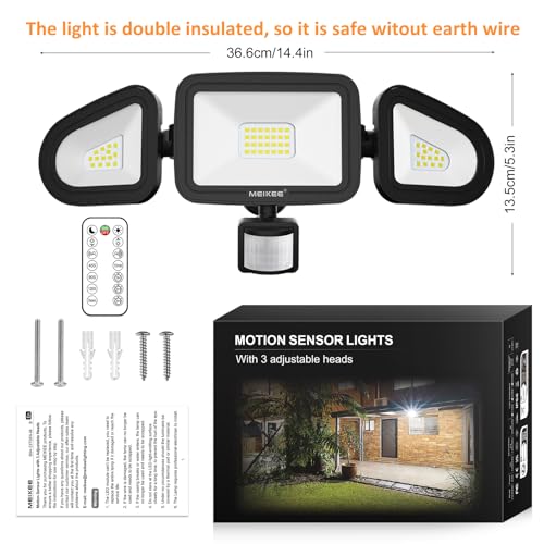 - [3 Modes with Remote Control]: MEIKEE LED outdoor security lights with motion sensor 42W achieves 3600LM ultra brightness, sensing distance adjustable: 6m, 9m, 12m, lighting time(45s-90s-120s-5min-10min), lighting mode(24 hours detection mode, night only detection mode, and constant on mode). It is equipped with remote control for easy operation, no need for climbing to adjust the motion sensor