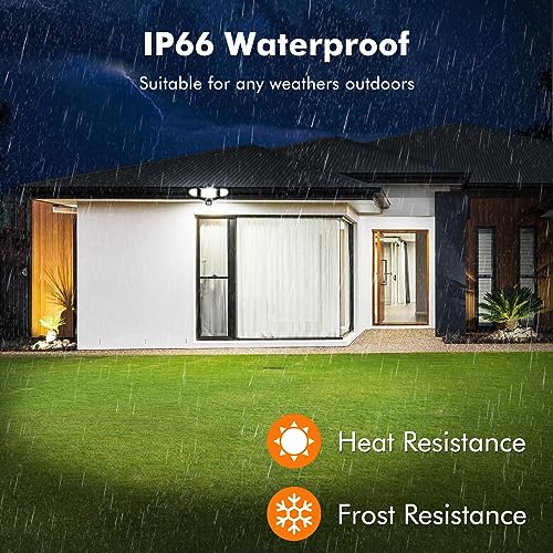 - [IP66 waterproof]: This outdoor flood light is built with aluminium material, strong impact resistance, heat sink design dissipates heat efficiently. The protection class of led floodlight is IP66, of infrared sensor is IP65, the LED floodlight is protected against moisture and dust, ensure the light work properly no matter in rainy, snowy, heat or cold environment, perfectly as a outdoor lighting for safety of your home