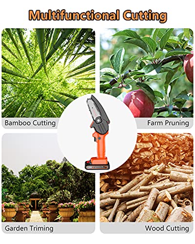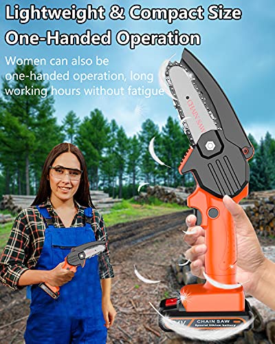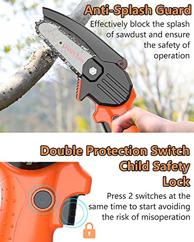 - 【High security & Anti-Splash Guard】Add a Safety Lock and a Safety Bezel to mini chainsaw to ensure safety. Press the lock button and switch button simultaneously to start small chainsaw, can effectively avoids misoperations and potential risks. Chainsaw is equipped with a safety bezel to prevent fast-moving wood chips and debris from flying on your face and eyes