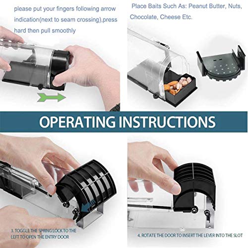- 🐭【EASY TO MAINTAIN】: Bxlive humane mouse trap for indoors can be reused. Made of sturdy, transparent ABS material, it can be reused. It can be rinsed directly with water. ( How to open the bait compartment: ①Press it inward, don't let go, ②and then push it upward.)