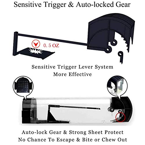 - 🐭【HIGHLY SENSITIVE & PREVENT ESCAPE】Adopting a sensitive sensor pedal structure and spring door lever system, the pedal quickly releases the spring door when it detects the weight, and locks the mouse in the cage. The door can only be opened from the outside, effectively preventing rats from escaping. Furthermore, our durable mouse trap can be reused, hard to be destroyed by rats. Thus, you will hard to have the opportunity to buy another mouse trap again.