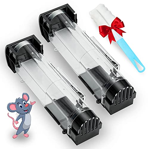 - 🐭【EASY TO USE】: Humane mouse traps for indoors, just open the spring door at one end of the small lid of the mouse trap and put the bait into it. The mouse hole design reduces the alertness of the mouse. Once the mouse enters the mouse traps and touches the pedal, its weight and movement activate the spring mechanism. Finally, the door will close quickly. You can find that whether to hold the mouse through the transparent design and reduce contact with mice.