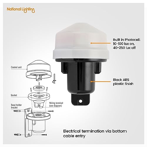 • Features a built-in photocell. <10-100 Lux (ON), >40-250 Lux (OFF). Rated Current: 10A