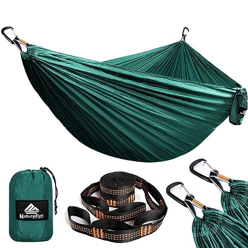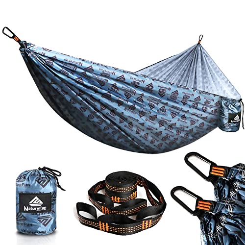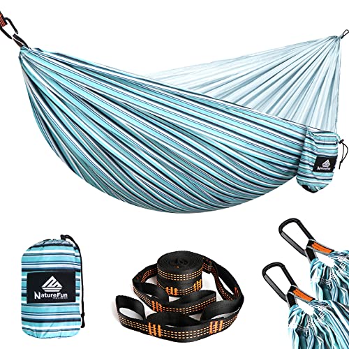 - EASY TO SET UP -- This portable hammock redefines camping. Instead of carrying a heavy mat and sleeping bag, just tuck the hammock into the small attached bag, put it in your bag and leave. The looped straps make everything easier,never need to knot again,you can set up the hammock in seconds.When you've found the best camp spot, setup is fast and extremely simple for even the most novice user! Let's leave the job and worries behind and enjoy a fun and relaxing time with Naturefun hammock.