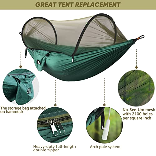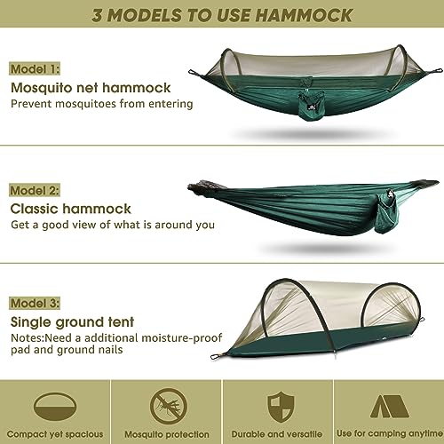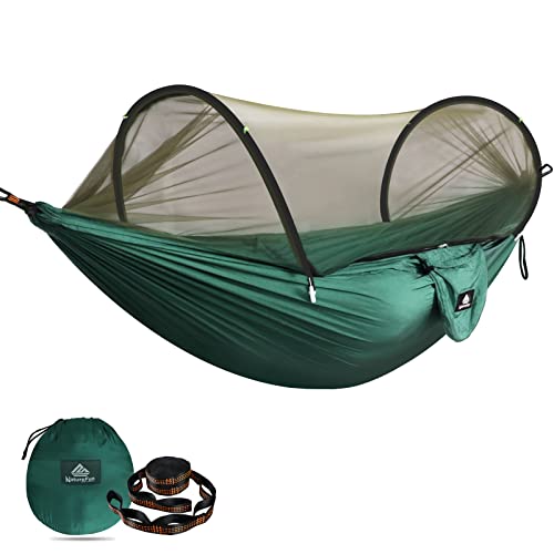 - STRONG FOR EASY TRAVEL, CAMPING & SET UP - Just stuff the hammock into the small attached sack, put it in your pack and off you go. When you've found the best camp spot, setup is a breeze with the included steel carabiners and tree friendly straps.You can even hang your hammock between 2 trees over 19.7ft apart thanks to the two 9.2ft straps.Never need to tie the ropes for mosquito net.The moment you pull out the hammock from the bag,the net will automatically pop up.