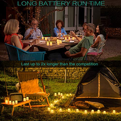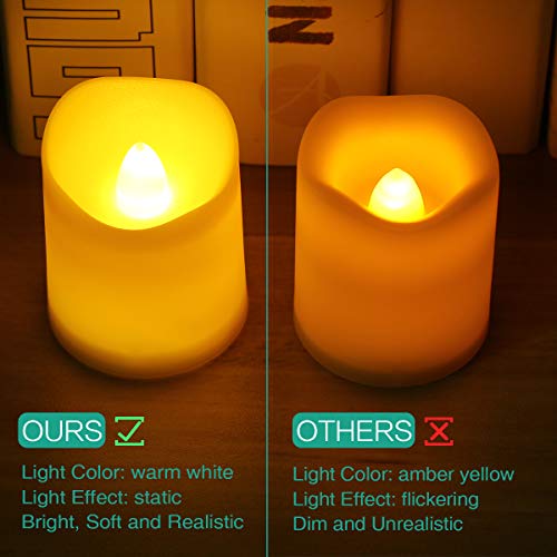 - 【Indoor and Outdoor Use】 Warm white color LED tea light candles provide more bright and beautiful effect than warm yellow one. The flameless votive candles with candle holders or other holders like glass cups can be widely used for birthday, Christmas, home decorations, parties, holidays, wedding, outdoor event, DIY projects and etc.