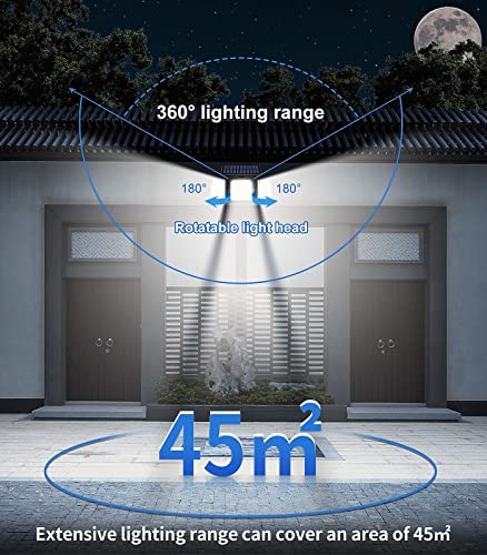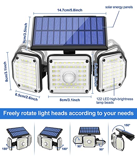 - 💡【360° Rotatable Solar Security Light with 3 Heads】 – Solar powered flood light features 3 lamp heads that can be rotated 180° left and right and up and down, giving you more flexibility to adjust the lighting direction according to your needs. It can provide a wider 360° lighting range to brighten up your patio, stairs and way home