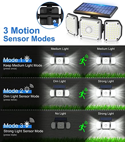 - 💡【3 Intelligent Lighting Modes】 – Solar motion sensor light outdoor has 3 modes: ① Medium light mode: press switch button once, keep medium brightness all night; ② Dim light sensor mode: press switch button twice, keep dim light when there is no movement, turns strong light when motion is detected; ③ Strong light sensor mode: press switch button triple, it will not light when there is no action, turns strong light when motion is detected. Meet your different needs