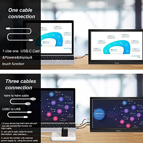 Product Description 2 Full Featrued USBC Interface As long as your device interface supports full-featured USBC interface output Only one cable is needed to connect any of the USBC interfaces for power touch and audio output Prechen 11.6 Toucscreen Monitor Display Screen: 11.6 inch Aspect Ratio: 16:9 Refresh Rate: 60HZ 10 Point Touch Full Featured USBC Built-in Kickstand 10-Point Touch 11.6 Inch Portable Monitor Touchscreen Support 10 Point Touchs ,create an ultra-responsive touchscreen experience that responds to every tap, pinch, scribble, and swipe. Lightweight and Portable This Monitor only 1.32lb and 0.19 ideal for business travel with you, say goodbye to the traditional desktop computer more portable, improve efficiency while also reducing the burden of travel luggage Built-in Speaker and Stand The 11.6" portable display has two built-in speakers that provide clear audio quality. The monitor's built-in stand can be adjusted by 90 degrees to suit your needs Turn your Phone as PC Monitor As long as your Android smartphone is full featured usbc interface through a single USB-C cable to watch the video or teaching courses. You can also choose desktop mode or phone mode through your phone. Its versatility helps you get things done more efficiently.