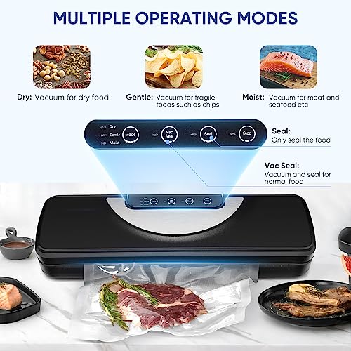 - 🥦【Multiple Modes】The vacuum food sealer can be used both dry and moist, providing vac seal, seal only and external vacuum functions, suitable for dry and moist foods such as snacks, cakes, meat and fish. The external vacuum feature allows for an air suction hose for easy vacuuming of wine bottles and other containers.