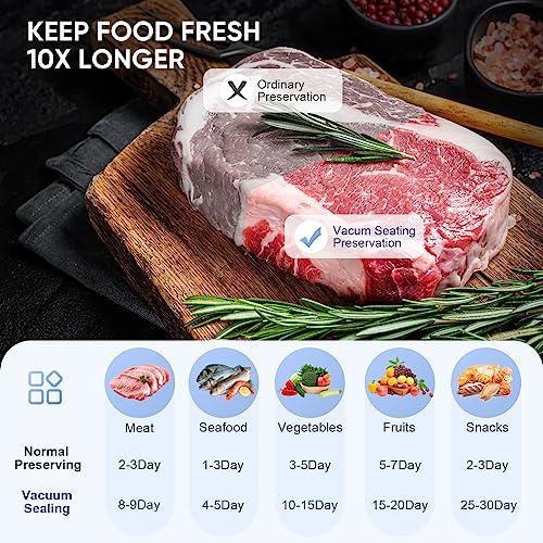 - 🥦【Keep Food Fresh】The vacuum sealer machine can effectively separate moisture and air, slow down the oxidation process and can prolong food freshness by 7 times. It is widely used in fresh food, frozen food, dry goods to prevent spoilage and food waste.