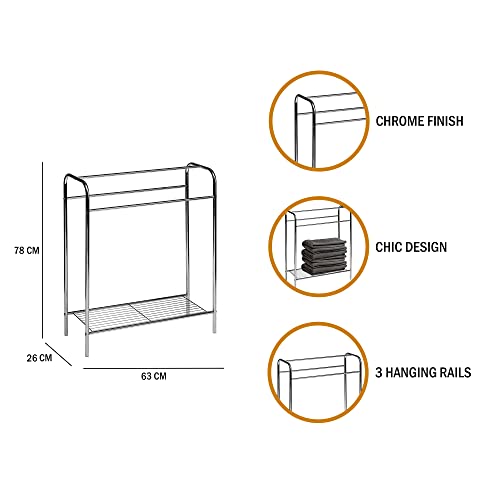 From the manufacturer Premier Housewares Chrome Floor Standing Towel Stand A wonderful addition in your bathroom, the floor standing towel stand will allow you to keep essentials close to hand and your bathroom clutter free. Made from steel, the tube frame features a chrome finish ensuring durability, while complementing a modern setting. Three bars across the top, at two different levels, allows your towels to dry more efficiently. At the bottom, a wire shelf is ideal for storing your dry towels, helping to keep an organised bathroom. Sturdy and stable, the towel stand brings a functional piece that will be used daily. Features Storage solution.3 hanging rails.Wire shelf.Durable and sturdy.Organise your bathroom.