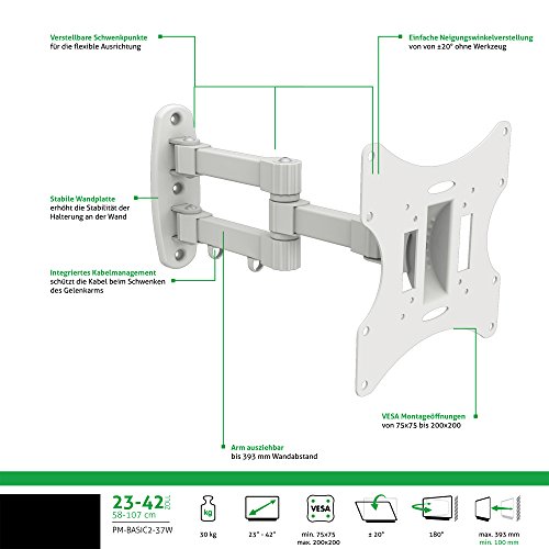 - Fully adjustable - up to 180 ° Pivot, +/-20 ° inclinable: +/- 20 °, adjustable: +/- 90 °, white