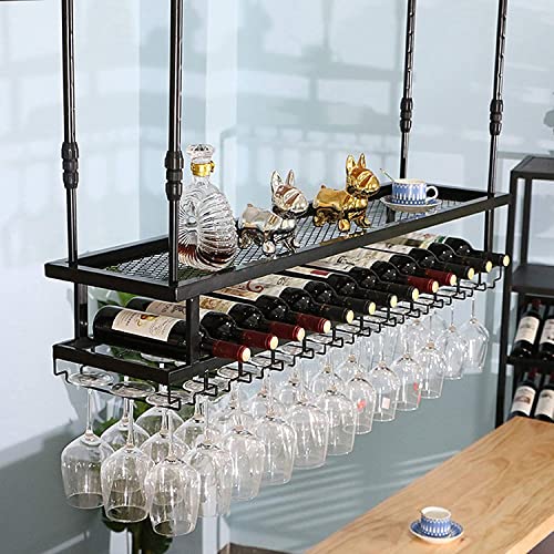 - 【2-IN-1 HANGING WINE RACK CEILING ORGANIZER】Increase the storage capacity of your home bar. The upper shelf of floating wine wall holder holds 12 standard wine bottles while the lower stemware rack can store 36 stemmed glasses.
