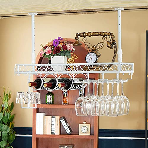 - 【2-IN-1 HANGING WINE RACK CEILING ORGANIZER】Increase the storage capacity of your home bar. The upper shelf of floating wine wall holder holds standard wine bottles while the lower stemware rack can store stemmed glasses.
