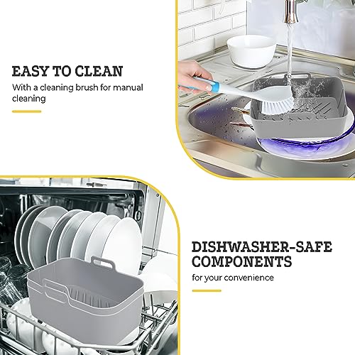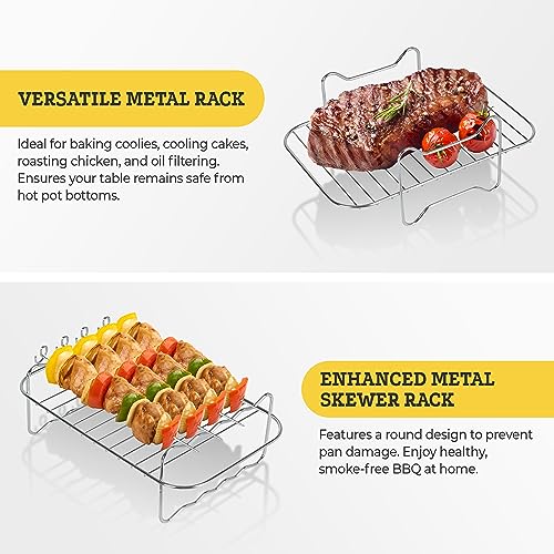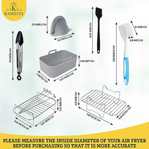 - 【9-PCS Air Fryer Accessories Set】Each set comes with two air fryer silicone liners,1 stainless steel grill rack, 1 stainless steel skewer rack with 4 skewers, 1 food tong, 1 oil brush and two anti-scald silicone gloves, cleaning burush. You get the most out of your air fryer everything you need for a complete air frying experience.Upgrade your air frying game with our silicone air fryer liner and accessories today