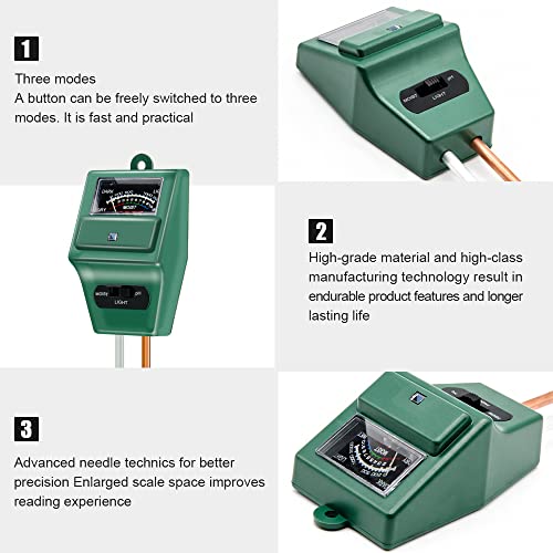 - 3-IN-1 FUNCTION: Test soil moisture, pH value and sunlight level of plant with our soil meter, helps you specialize in grasping when you need to water your plant.