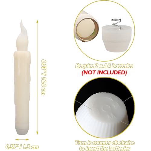 • 【EASY TO USE】- Our battery-operated taper candles are easy to use. Removing the bottom cap, inserting 2 AA batteries (BATTERIES NOT INCLUDED), and tighten/lose the bottom cap of the candle for easy ON/OFF operation.