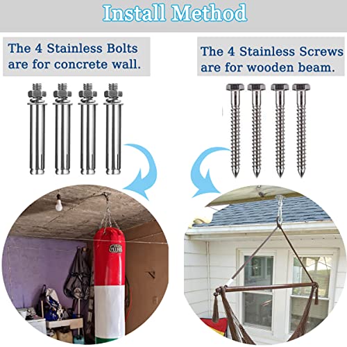- Install Method: the 4 Stainless Screws are for wooden beam, the 4 Stainless Bolts are for concrete wall. The hammock hanging kit will work well on wooden beams or concrete.