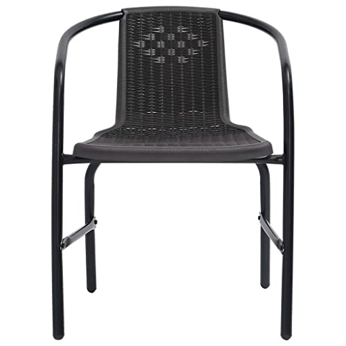 - Thanks to the steel frame, the outdoor chairs are stable and sturdy. The table top is made of thick tempered glass, which makes it easy to clean. The plastic rattan chairs contribute to the seating comfort. In addition, the armchairs are stackable to save space when not in use.